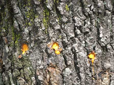 どうも樹液のようです。さすがに触るのはやめました。桜の樹がはちみつ色の樹液を