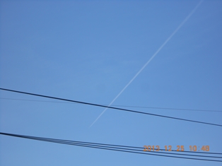 快晴の真っ青なキャンバスに一本の飛行機雲が端から端まで真っ直ぐに