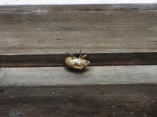 神社の舞台には、夏の名残りを惜しむかのように蝉の抜け殻がしっかりと