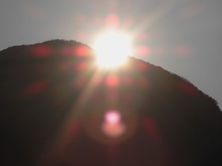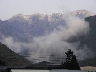 泊まった洞川温泉の宿から見える、頭に白い帽子をかぶった金峰山。