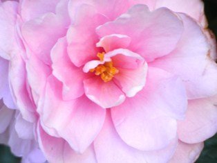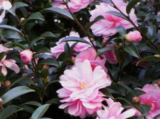 その帰り道、小さな植え込みに、つばき?サザンカ?がピンクの美しい色