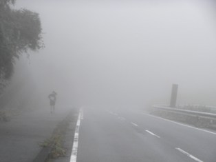 無事にお水も汲み、来た道を戻っていると霧の中をマラソンが行われてい