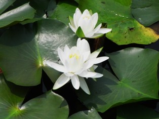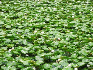 ため池に蓮が花を咲かせ始めていました。花はみな白ばかりでした。