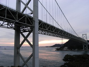 朝日が昇る関門海峡はたくさんの船が行き来していました。