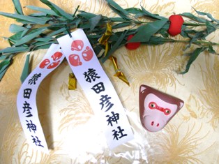 可愛い猿のお面は災難除けに、玄関に吊るします。