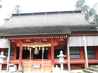 茶店で竹の杖をお借りし、階段を幾段も上り、英彦山神宮泰平殿へ。