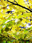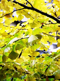 山間の美しき色合いの中で銀杏の木が、際立って黄色く色づいています。