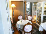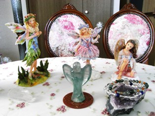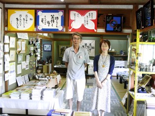 風が風鈴と木々と小鳥を通して入って来ます。室内にはたくさんの詩や絵や陶芸、さげもん等たくさん展示販売されて