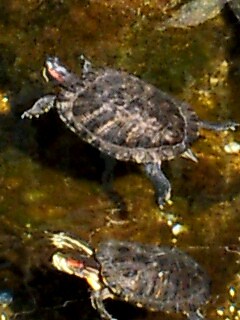 しました。大きな亀のモニュメントからミドリガメがいっぱい泳いでいま