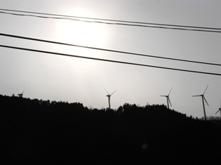山の上に立つ風力発電のプロペラ。