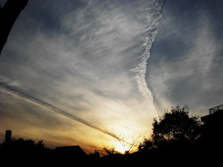 その帰り道、飛行機雲から発達した雲が暮れゆく夕日の中で、大きな羽