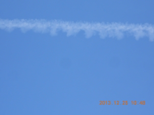 快晴の真っ青なキャンバスに一本の飛行機雲が端から端まで真っ直ぐに